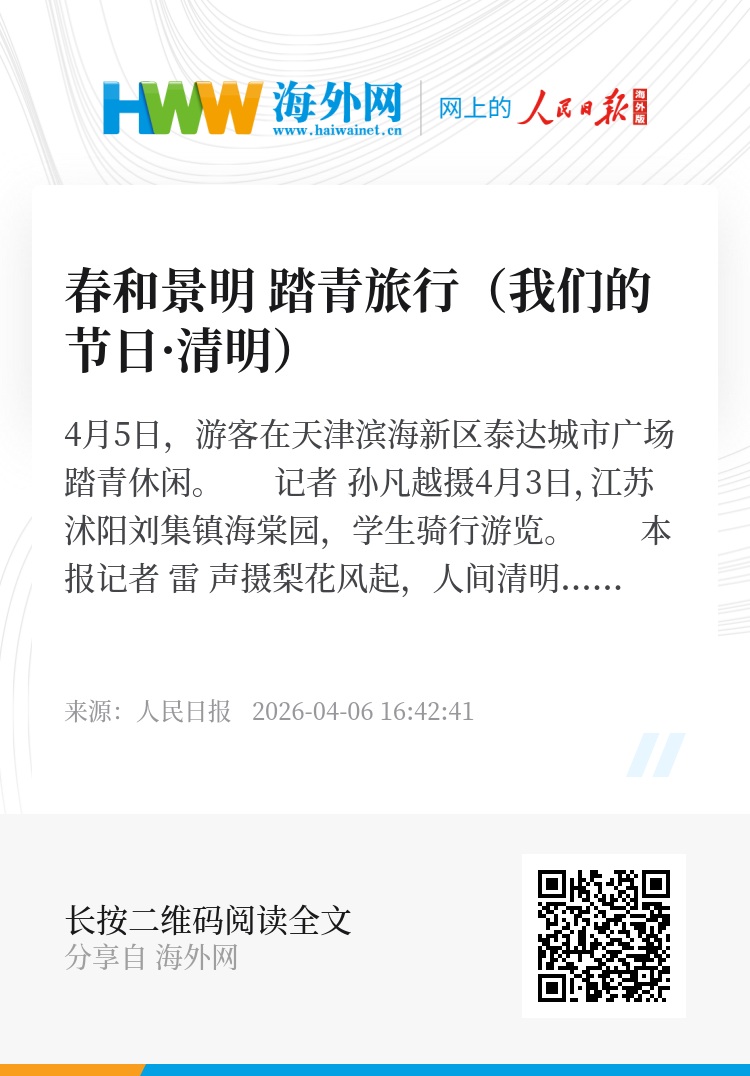 梨花风起,人间清明。从春山上的缅怀时刻,到公园里的亲子时光;从乡间的烂漫山花,到城外的依依杨柳……祖国各处春光万里、生机无限。春和景明,人们竞相出游踏春,尽享假期。