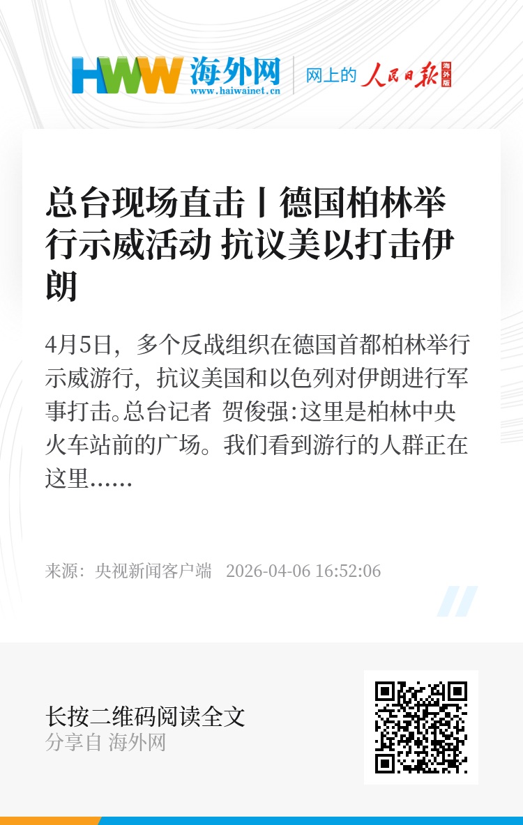 总台记者 贺俊强:这里是柏林中央火车站前的广场。我们看到游行的人群正在这里聚集,将沿着市中心主要街道向勃兰登堡门方向行进。现场看到多个反战组织的民众手举标语,高喊口号,表达对当前中东局势升级的担忧,以及对和平的呼吁。