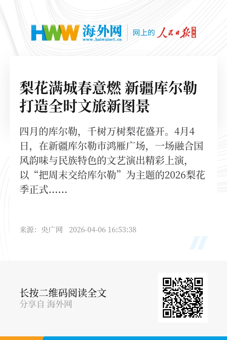 活动周期为4月4日至30日,同时联动4月至10月的铁门关、鸿雁广场等经典旅游活动和路线,以及香梨大道、永安大道自驾观花路线,将“一季梨花盛景”转化为“全年旅游热度”。库尔勒正从单一的“赏花目的地”,加速升级为综合性“休闲度假目的地”。