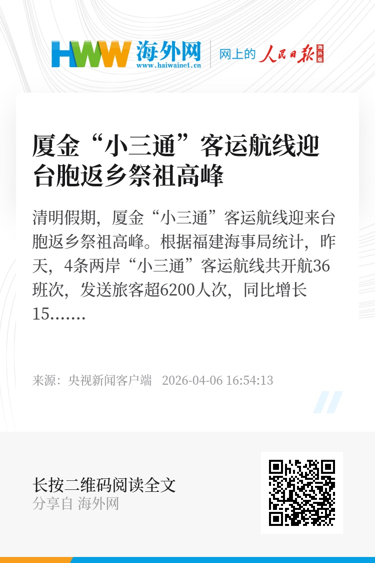 清明假期,厦金“小三通”客运航线迎来台胞返乡祭祖高峰。根据福建海事局统计,昨天,4条两岸“小三通”客运航线共开航36班次,发送旅客超6200人次,同比增长15.84%。其中,客流量最大的厦门—金门“小三通”航线发航24班次,运送旅客超5500人次,同比增长15.59%。