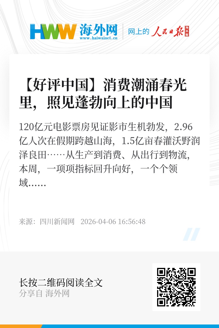 假日消费是观察经济活力的重要窗口。“春假+清明”最直观的感受就是一个字:热!放眼神州大地,文旅景区人头攒动,餐饮商圈客流如织,品质化、体验式、文化类消费持续走俏,一幅幅精彩的春日图景,汇成一股强劲向上的发展洪流。从家门口的烟火气,到天南地北的出游热,从丰富的消费场景,到不断涌现的消费新亮点,处处都透着生机与活力。假日里的火热景象,不只是政策红利的精准释放、民生需求的稳步升级,更透过一组组亮眼数据、一个个火热场景,勾勒出热气腾腾的中国图景,为经济稳步前行写下生动注脚。