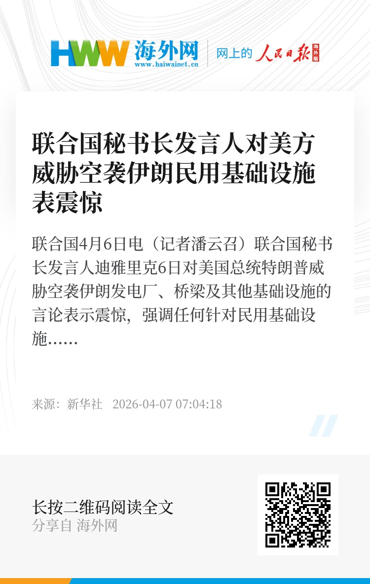 新华社联合国4月6日电(记者潘云召)联合国秘书长发言人迪雅里克6日对美国总统特朗普威胁空袭伊朗发电厂、桥梁及其他基础设施的言论表示震惊,强调任何针对民用基础设施的攻击都违反国际法。