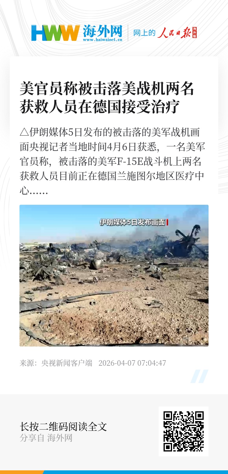 央视记者当地时间4月6日获悉,一名美军官员称,被击落的美军F-15E战斗机上两名获救人员目前正在德国兰施图尔地区医疗中心接受治疗。