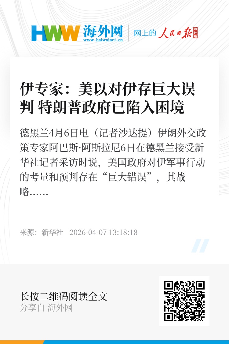 新华社德黑兰4月6日电(记者沙达提)伊朗外交政策专家阿巴斯·阿斯拉尼6日在德黑兰接受新华社记者采访时说,美国政府对伊军事行动的考量和预判存在“巨大错误”,其战略目标均未达成,且已陷入“越挣扎越困难”的局面。