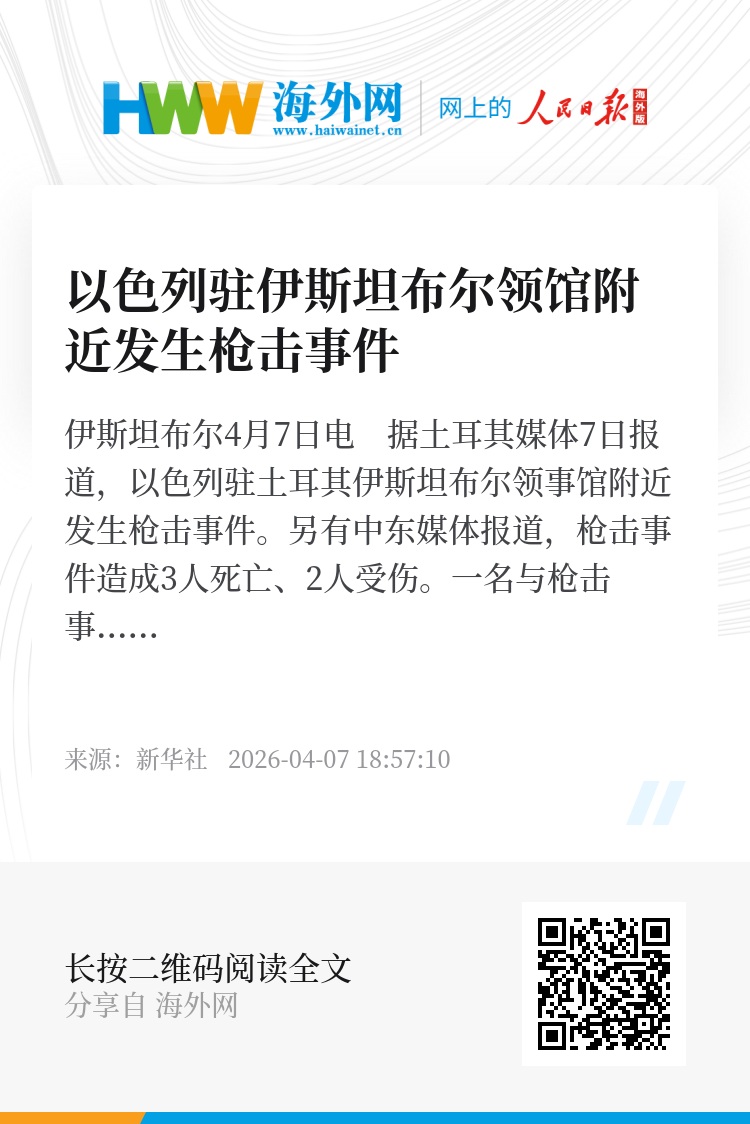 新华社伊斯坦布尔4月7日电 据土耳其媒体7日报道,以色列驻土耳其伊斯坦布尔领事馆附近发生枪击事件。另有中东媒体报道,枪击事件造成3人死亡、2人受伤。一名与枪击事件有关的人员已被警方控制。