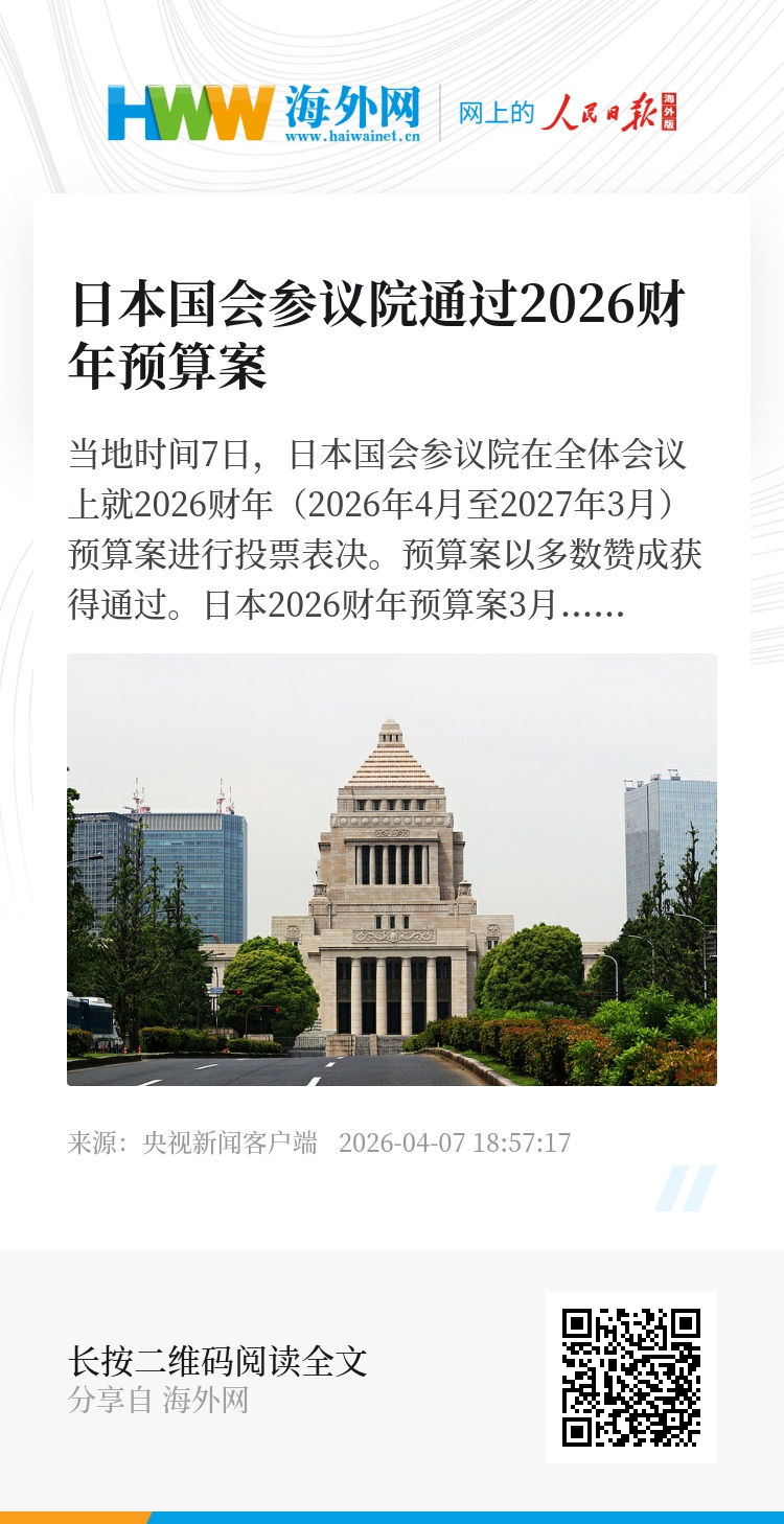 当地时间7日,日本国会参议院在全体会议上就2026财年(2026年4月至2027年3月)预算案进行投票表决。预算案以多数赞成获得通过。