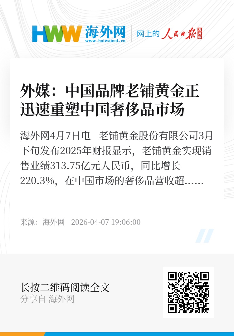 海外网4月7日电 老铺黄金股份有限公司3月下旬发布2025年财报显示,老铺黄金实现销售业绩313.75亿元人民币,同比增长220.3%,在中国市场的奢侈品营收超过爱马仕等全球奢侈品品牌,引发外媒关注。