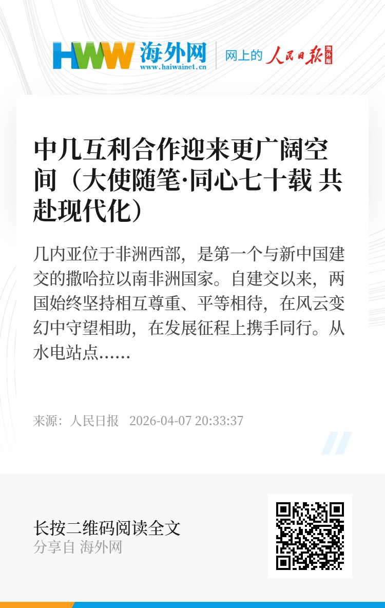 今年适逢中非开启外交关系70周年。近年来,在两国元首战略引领下,中几全面战略合作伙伴关系持续深化,传统友谊历久弥坚,互利合作成果丰硕。今年2月,习近平主席向第39届非洲联盟峰会致贺电时宣布,中方将于2026年5月1日起对53个非洲建交国全面实施零关税举措。这一重大举措生动彰显了中国大国担当和中非深厚友谊,将有力推动中非在新的历史起点上拓展互利合作,实现共同发展。中几两国深化友好合作将迎来更广阔的前景。