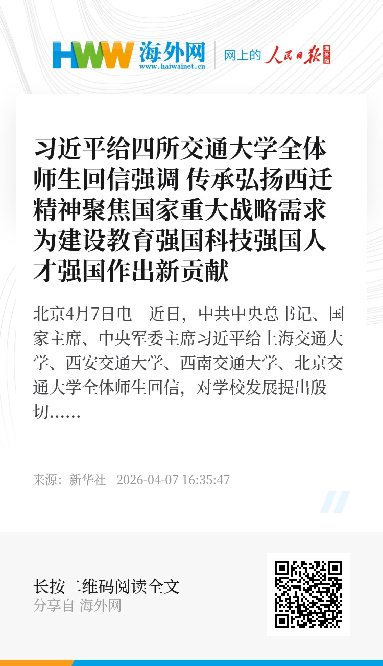 新华社北京4月7日电 近日,中共中央总书记、国家主席、中央军委主席习近平给上海交通大学、西安交通大学、西南交通大学、北京交通大学全体师生回信,对学校发展提出殷切期望。