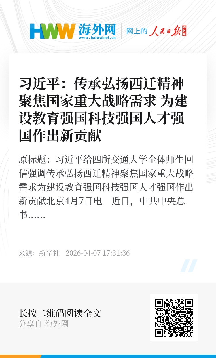 新华社北京4月7日电 近日,中共中央总书记、国家主席、中央军委主席习近平给上海交通大学、西安交通大学、西南交通大学、北京交通大学全体师生回信,对学校发展提出殷切期望。