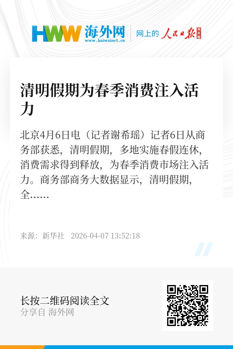新华社北京4月6日电(记者谢希瑶)记者6日从商务部获悉,清明假期,多地实施春假连休,消费需求得到释放,为春季消费市场注入活力。