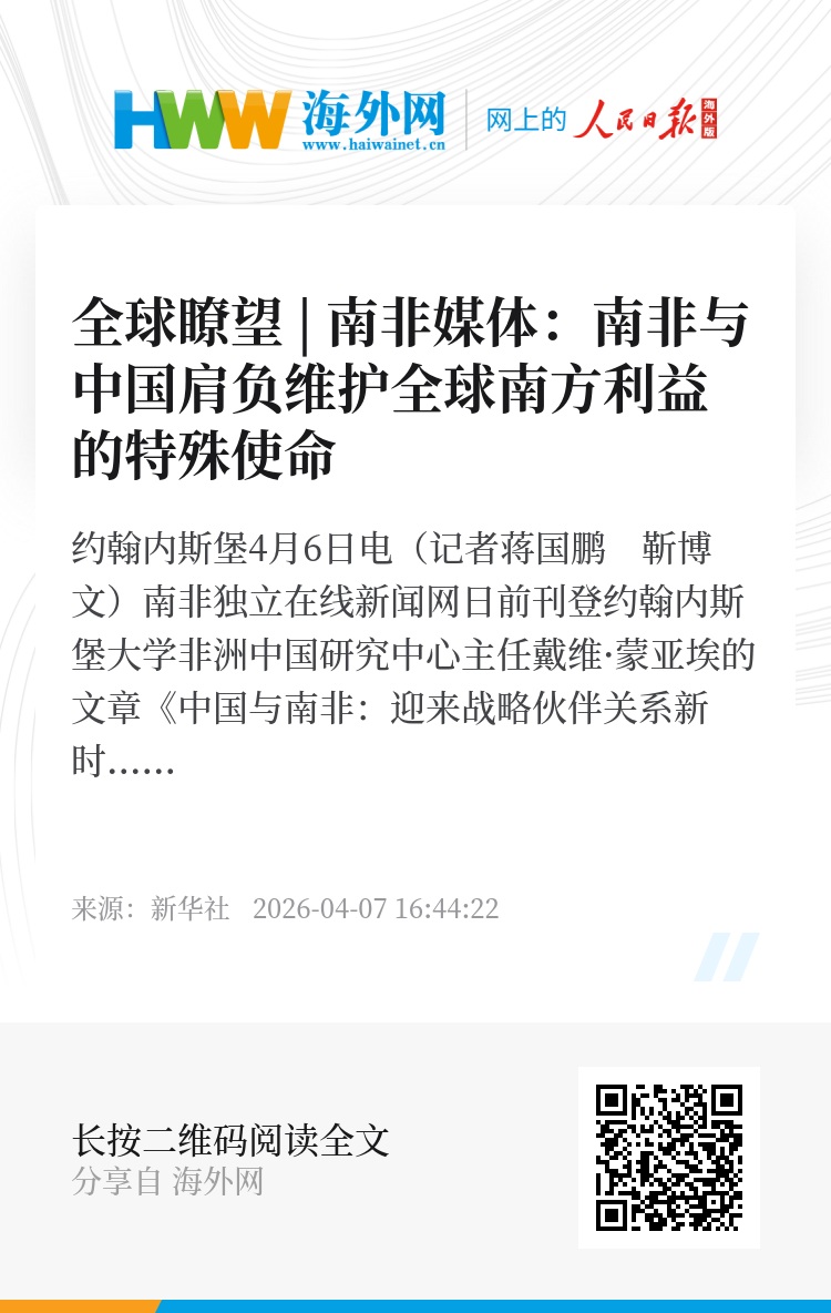 新华社约翰内斯堡4月6日电(记者蒋国鹏 靳博文)南非独立在线新闻网日前刊登约翰内斯堡大学非洲中国研究中心主任戴维·蒙亚埃的文章《中国与南非:迎来战略伙伴关系新时代》指出,南中关系具有重要战略与全球影响,两国肩负着维护全球南方利益、推动构建公平正义国际秩序的特殊使命。文章摘要如下: