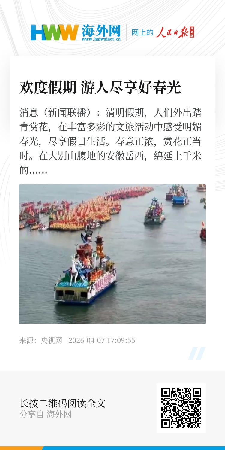 赏春光,品民俗。4月6日,在江苏泰州,水上庙会——溱潼会船节精彩上演。当地结合民俗展演,推出非遗、农耕等四大主题研学线路,吸引了众多青少年前来体验,成为假日文旅新亮点。在四川崇州元通古镇,300多米长的“汇江老龙”巡游,还有金牛闹春等传统民俗,带动文旅市场热度持续攀升,清明假期累计接待游客超26万人次。山西忻州古城人气十足,大家在漆扇、香囊制作中感受传统文化,定格春日美好。