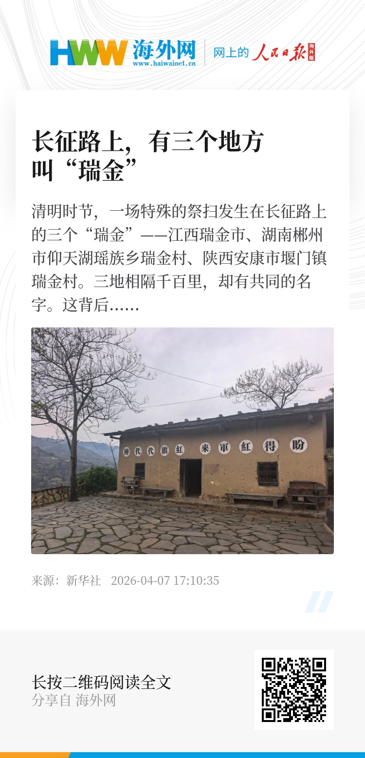 清明时节,一场特殊的祭扫发生在长征路上的三个“瑞金”——江西瑞金市、湖南郴州市仰天湖瑶族乡瑞金村、陕西安康市堰门镇瑞金村。三地相隔千百里,却有共同的名字。这背后是一段悲壮的红色记忆,也是一场跨越时空的深情奔赴。