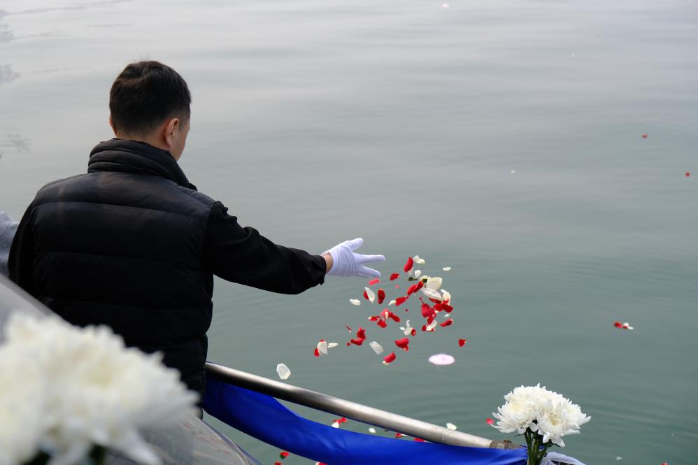 逝者家属在完成骨灰海葬仪式后将花瓣撒向大海。新华社记者 夏子麟 摄