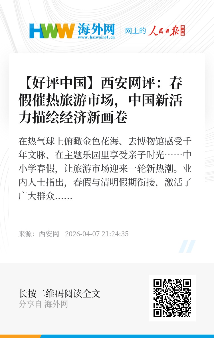春假背后的旅游热潮,是中国经济活力的生动缩影。它不仅体现了人们对美好生活的向往,更彰显了我国消费市场的强大韧性和潜力。从假期制度的探索完善,到文旅产品的创新升级,再到多业态的协同发展,春假正成为激活消费、拉动经济的新引擎。唯有持续优化假期安排、丰富消费供给、提升服务质量,才能让春假的“流量”持续转化为经济发展的增量,让文旅活力持续迸发,为中国经济高质量发展描绘更加绚丽的新画卷。(西安网特约评论员郭元鹏)