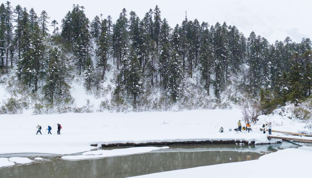 2026年3月21日,游人和当地向导徒步进入白普隆沟牧场。新华社记者 洛卓嘉措 摄