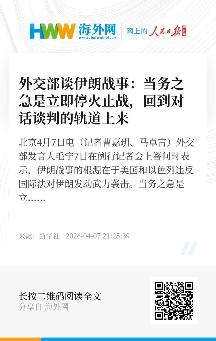新华社北京4月7日电(记者曹嘉玥、马卓言)外交部发言人毛宁7日在例行记者会上答问时表示,伊朗战事的根源在于美国和以色列违反国际法对伊朗发动武力袭击。当务之急是立即停火止战,回到对话谈判的轨道上来,从根本上解决问题,恢复海湾地区的和平稳定。