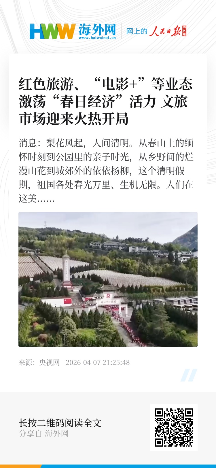 央视网消息:梨花风起,人间清明。从春山上的缅怀时刻到公园里的亲子时光,从乡野间的烂漫山花到城郊外的依依杨柳,这个清明假期,祖国各处春光万里、生机无限。人们在这美好的时节竞相出游踏春,乐享清明假期,也为春日经济写下深厚的人文注脚。
