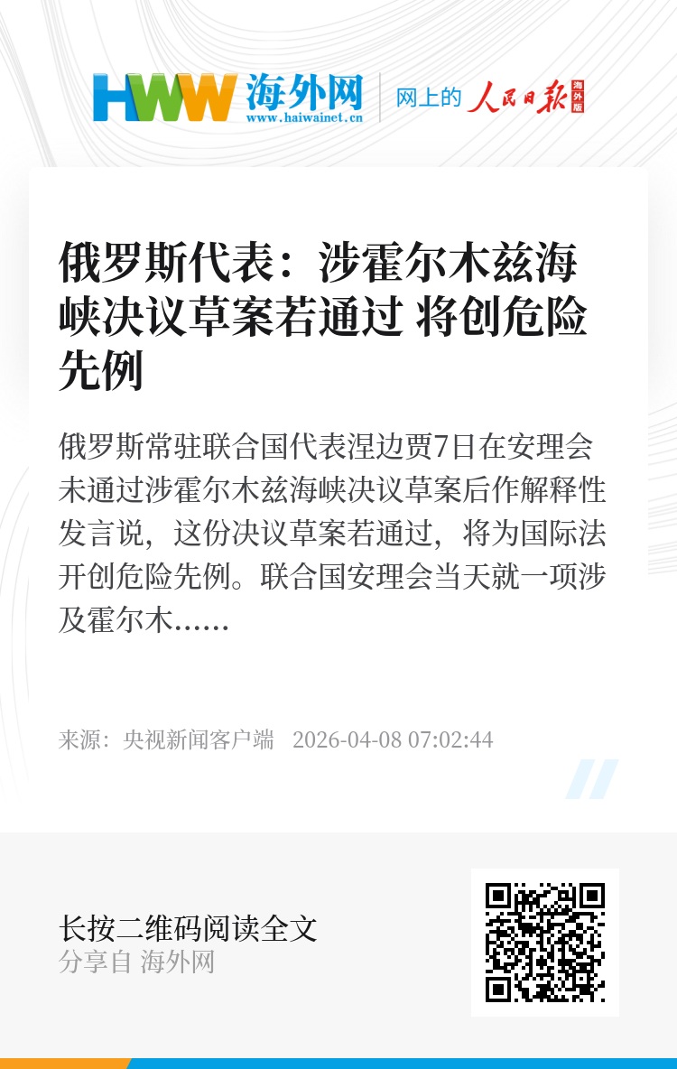 俄罗斯常驻联合国代表涅边贾7日在安理会未通过涉霍尔木兹海峡决议草案后作解释性发言说,这份决议草案若通过,将为国际法开创危险先例。