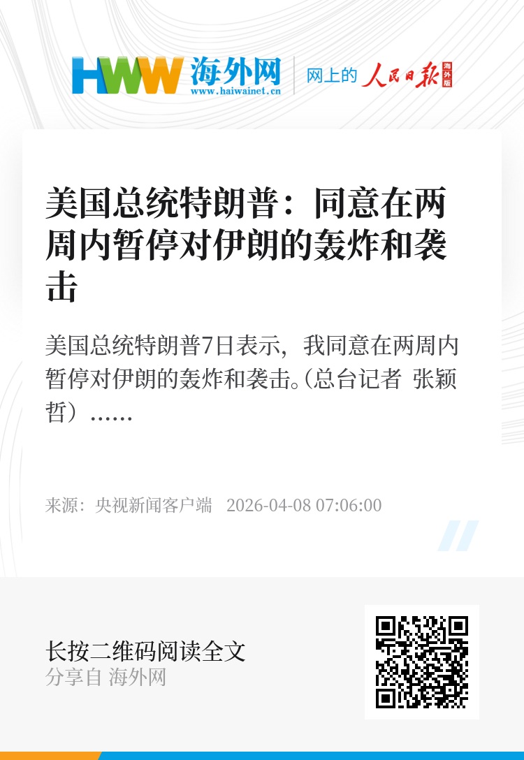 美国总统特朗普7日表示,我同意在两周内暂停对伊朗的轰炸和袭击。(总台记者 张颖哲)