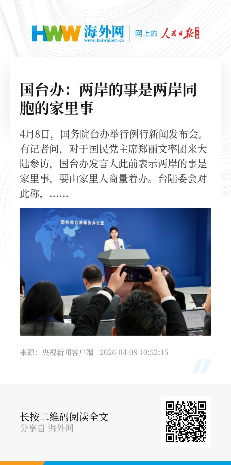 4月8日,国务院台办举行例行新闻发布会。有记者问,对于国民党主席郑丽文率团来大陆参访,国台办发言人此前表示两岸的事是家里事,要由家里人商量着办。台陆委会对此称,大陆的说法凸显其“反介入”与“两岸问题内政化”的意图。请问对此有何评论?