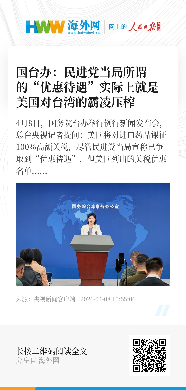 4月8日,国务院台办举行例行新闻发布会,总台央视记者提问:美国将对进口药品课征100%高额关税,尽管民进党当局宣称已争取到“优惠待遇”,但美国列出的关税优惠名单中并未提到台湾。请问对此有何评论?