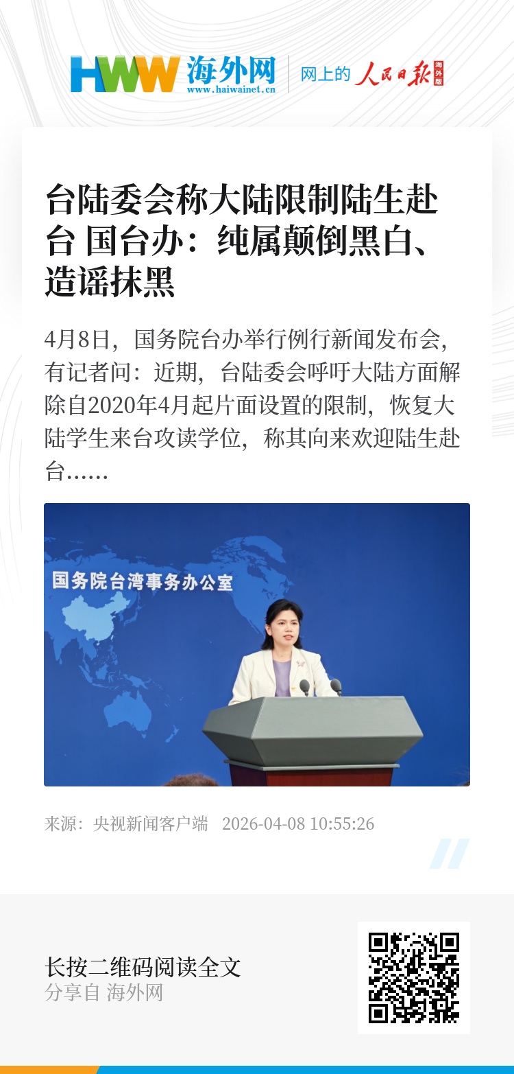 4月8日,国务院台办举行例行新闻发布会,有记者问:近期,台陆委会呼吁大陆方面解除自2020年4月起片面设置的限制,恢复大陆学生来台攻读学位,称其向来欢迎陆生赴台,因大陆政策限制,连续5年陆生新生来台为零,目前在台剩余学位生已大幅减少。请问对此有何评论?