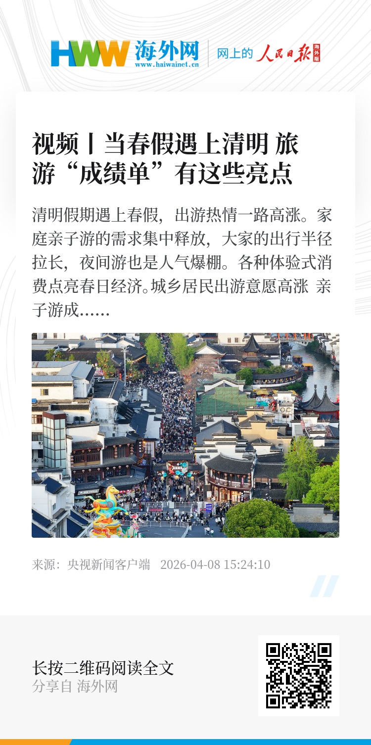 中国旅游研究院院长 戴斌:清明节假日期间,城乡居民出游意愿高涨,国内旅游出游人数、旅游花费、农村居民出游人数及外国人入境旅游人数等多项指标创下历史新高。