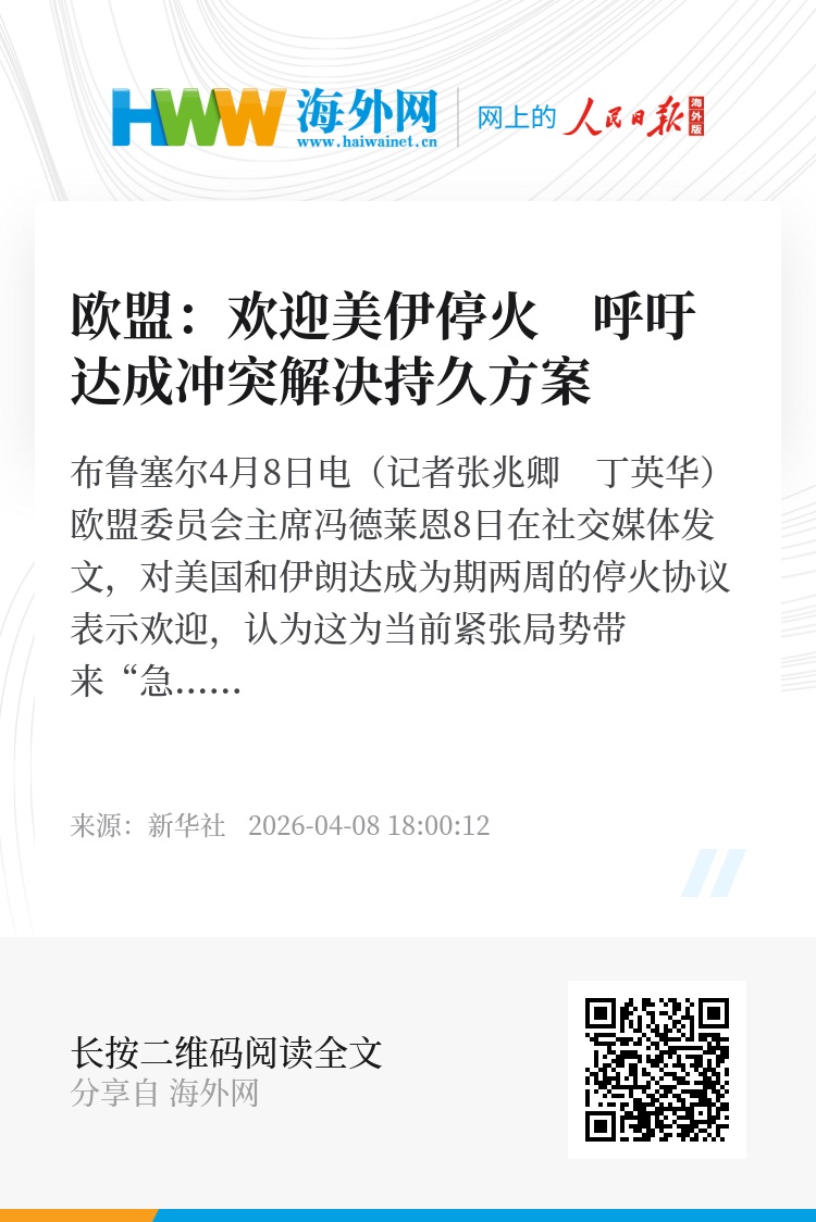 新华社布鲁塞尔4月8日电(记者张兆卿 丁英华)欧盟委员会主席冯德莱恩8日在社交媒体发文,对美国和伊朗达成为期两周的停火协议表示欢迎,认为这为当前紧张局势带来“急需的降级”。
