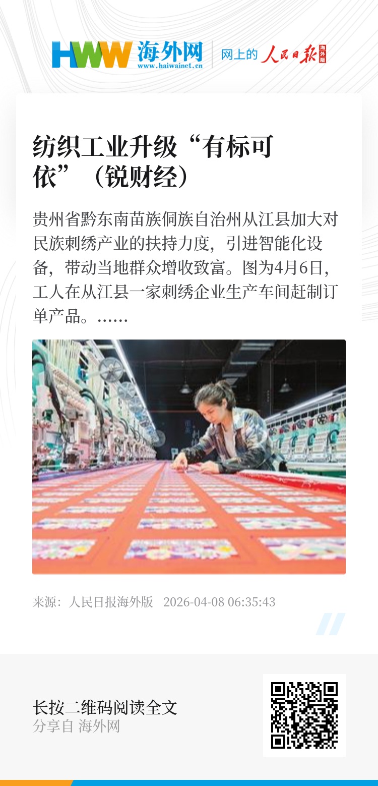 贵州省黔东南苗族侗族自治州从江县加大对民族刺绣产业的扶持力度,引进智能化设备,带动当地群众增收致富。图为4月6日,工人在从江县一家刺绣企业生产车间赶制订单产品。罗京来摄(人民视觉)