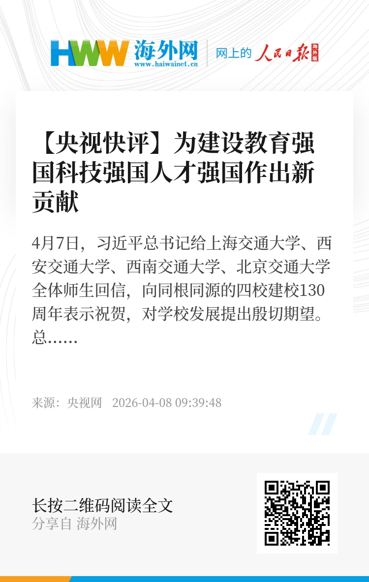 4月7日,习近平总书记给上海交通大学、西安交通大学、西南交通大学、北京交通大学全体师生回信,向同根同源的四校建校130周年表示祝贺,对学校发展提出殷切期望。总书记勉励四所高校广大师生“为建设教育强国、科技强国、人才强国作出新贡献”。