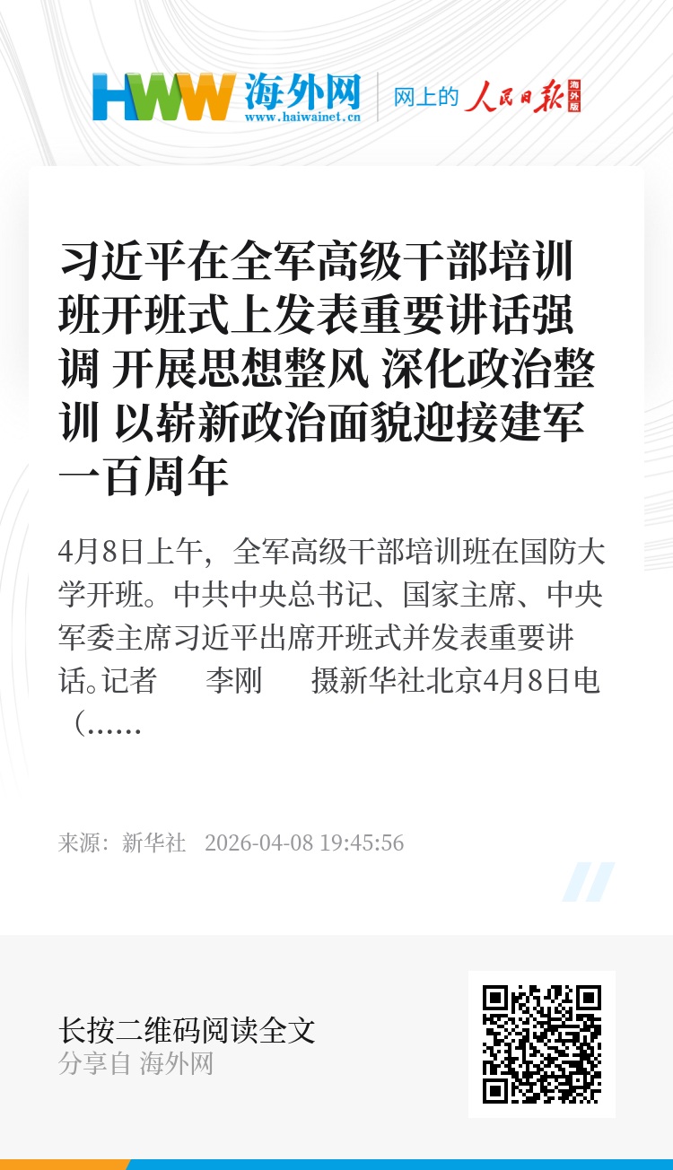 新华社北京4月8日电(记者梅常伟)全军高级干部培训班8日上午在国防大学开班。中共中央总书记、国家主席、中央军委主席习近平出席开班式并发表重要讲话。他强调,要以新时代中国特色社会主义思想为指导,深入贯彻新时代强军思想,开展思想整风,深化政治整训,加强我军干部队伍革命性锻造,始终保持人民军队纯洁光荣,以崭新政治面貌迎接建军一百周年。