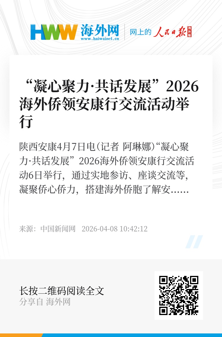 中新网陕西安康4月7日电(记者 阿琳娜)“凝心聚力·共话发展”2026海外侨领安康行交流活动6日举行,通过实地参访、座谈交流等,凝聚侨心侨力,搭建海外侨胞了解安康、感知安康、走进安康的平台,助力陕西县域经济、民营经济、开放型经济、数字经济发展。