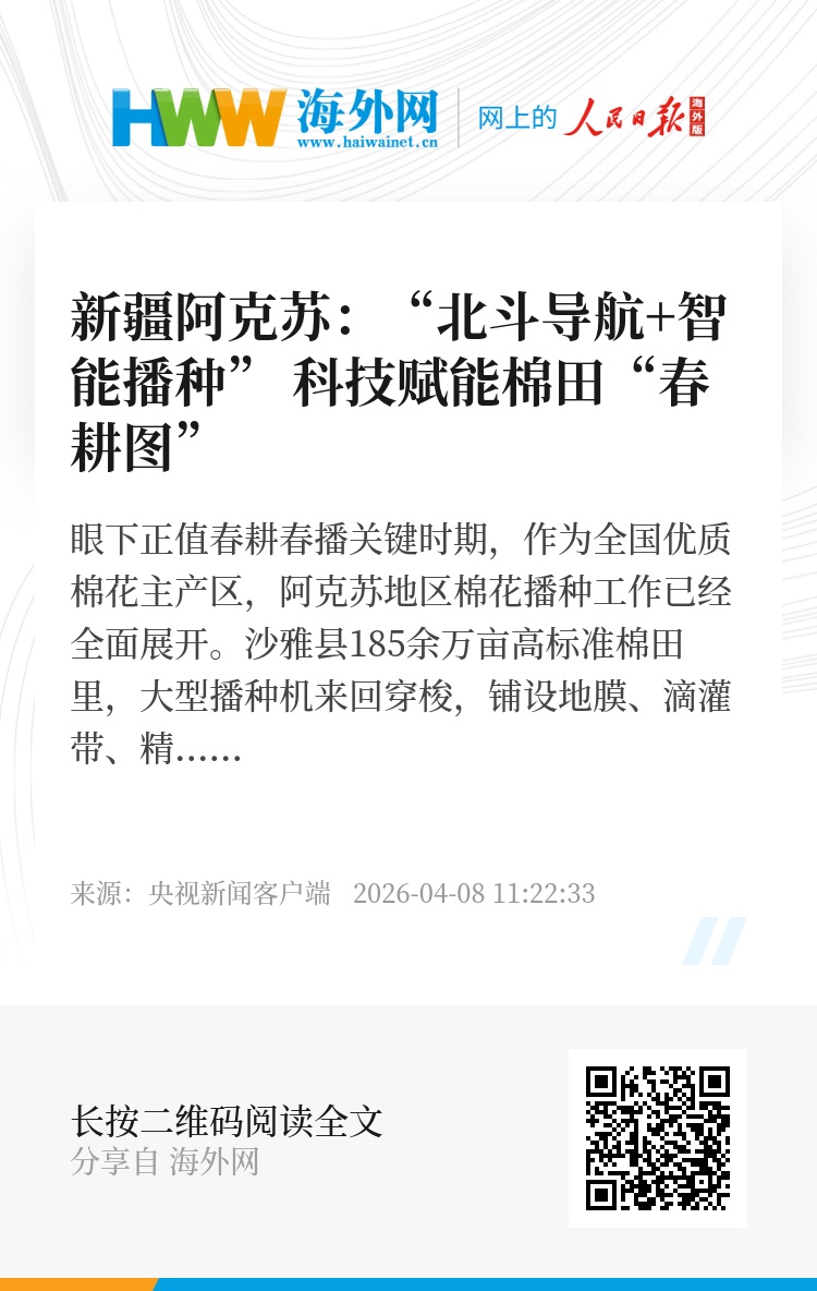 阿克苏地区棉花种植面积约750万亩,播种综合机械化率保持98%以上,预计四月下旬可全面完成播种,为棉花优质高产、棉农稳定增收筑牢坚实基础。(监制 张立 王新宇 主编 苏蒙 编辑 李振贤 合作单位 阿克苏地区融媒体中心 阿克苏市融媒体中心 沙雅县融媒体中心 新和县融媒体中心)