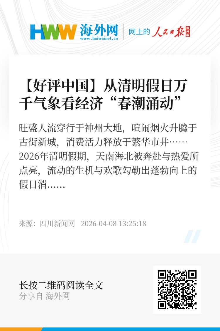 人间四月春光好,经济潮起正当时。清明假期的万千气象,是中国经济内生动力强劲、创新活力迸发的持久表征。各地要持续深耕体验经济、创新消费场景、打通流通堵点,让烟火气更旺、消费力更足、经济脉更活,春日里的经济热潮必将持续奔涌,为全年高质量发展注入源源不断的强劲动能。