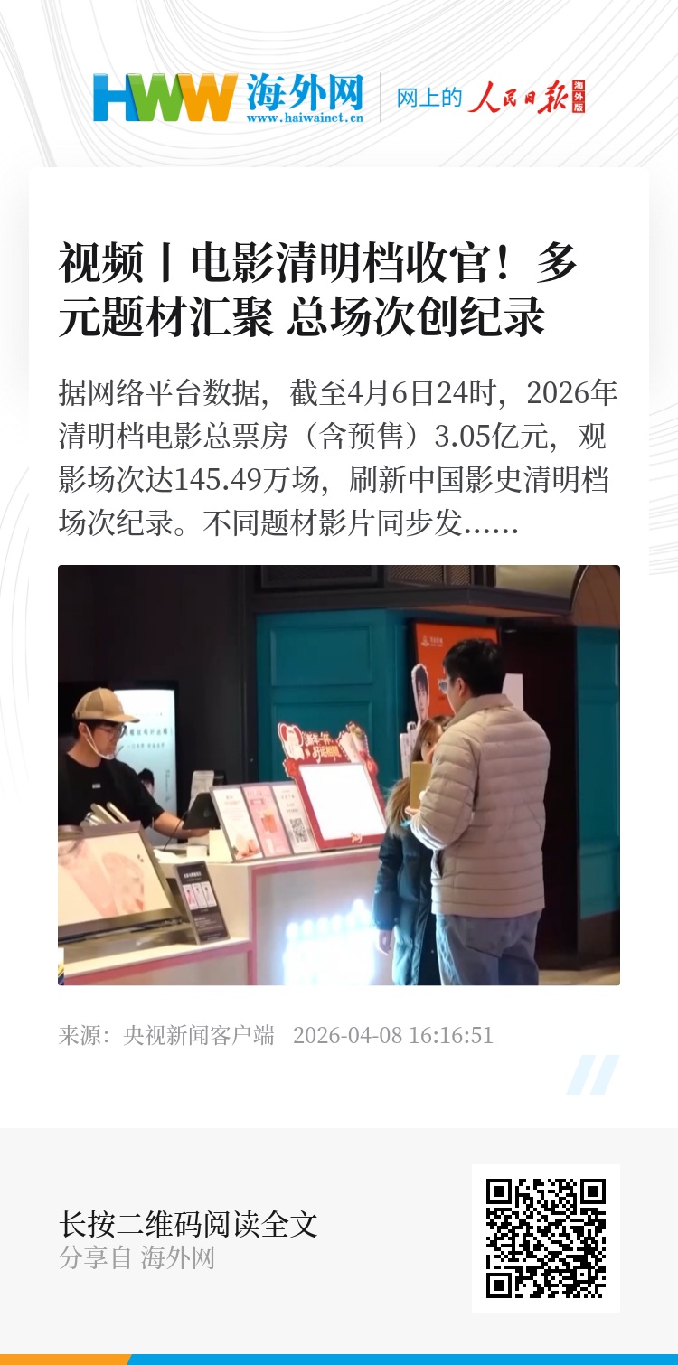 据网络平台数据,截至4月6日24时,2026年清明档电影总票房(含预售)3.05亿元,观影场次达145.49万场,刷新中国影史清明档场次纪录。