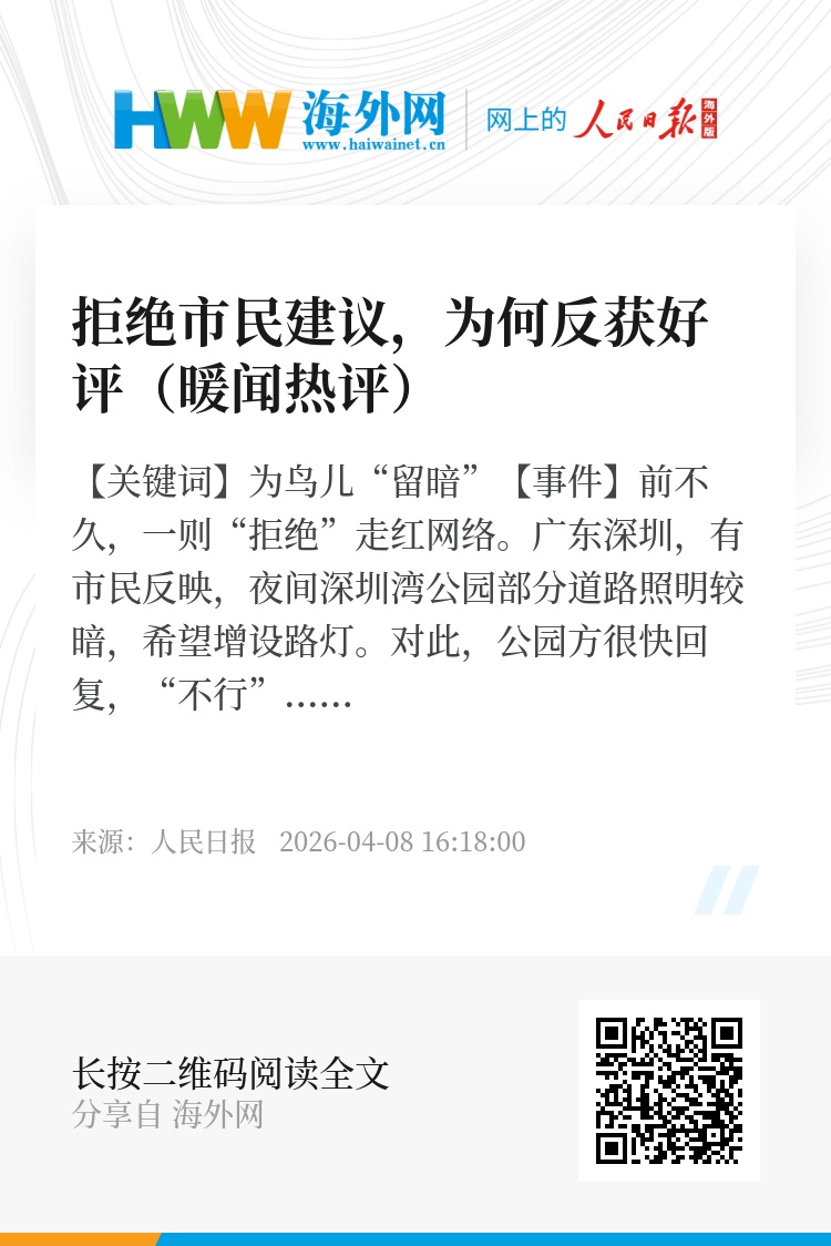 【事件】前不久,一则“拒绝”走红网络。广东深圳,有市民反映,夜间深圳湾公园部分道路照明较暗,希望增设路灯。对此,公园方很快回复,“不行”。其表示若增设过多高亮度灯具,将破坏生态平衡,尤其会干扰候鸟越冬栖息与迁飞节律;为兼顾市民夜间活动需求,已在主要出入口及交通节点保留基础照明。该做法获得网友好评。