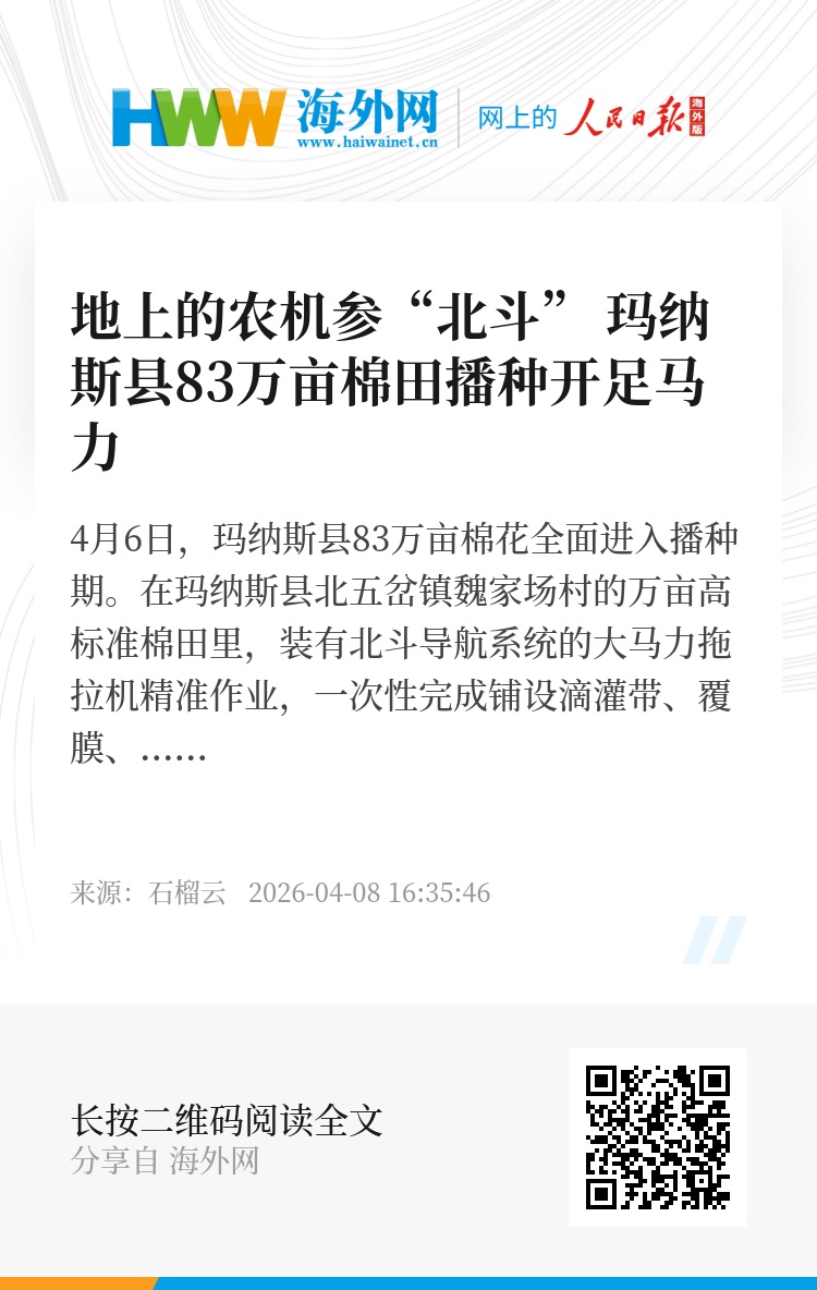 4月6日,玛纳斯县83万亩棉花全面进入播种期。在玛纳斯县北五岔镇魏家场村的万亩高标准棉田里,装有北斗导航系统的大马力拖拉机精准作业,一次性完成铺设滴灌带、覆膜、精量播种、覆土等多道工序,播行笔直、株距均匀,直线误差控制在2厘米以内,实现全程标准化、精细化作业。与传统播种方式相比,可节约棉种50%以上,提高土地利用率3%,并且方便后期机械化田间管理和采收。