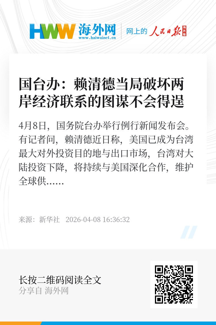 4月8日,国务院台办举行例行新闻发布会。有记者问,赖清德近日称,美国已成为台湾最大对外投资目的地与出口市场,台湾对大陆投资下降,将持续与美国深化合作,维护全球供应链安全。请问对此有何评论?