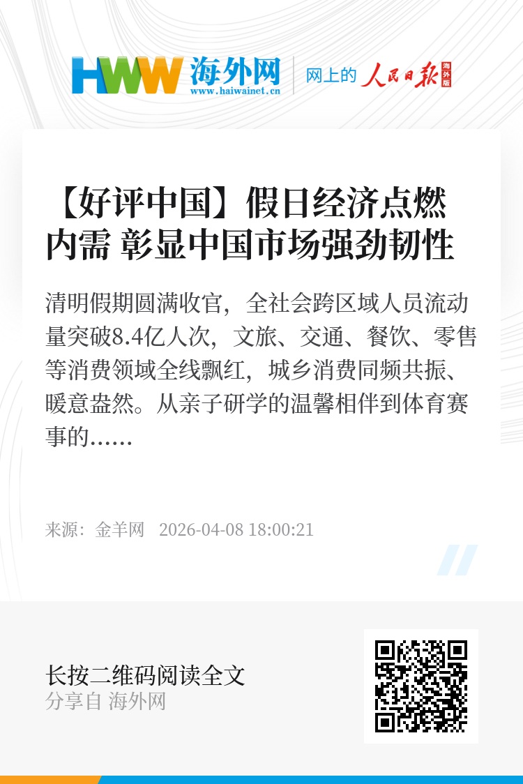 清明假期圆满收官,全社会跨区域人员流动量突破8.4亿人次,文旅、交通、餐饮、零售等消费领域全线飘红,城乡消费同频共振、暖意盎然。从亲子研学的温馨相伴到体育赛事的激情涌动,从春日赏花的诗意徜徉到演唱会场的热烈欢聚,一幅全链条联动、多层次拓展、广覆盖辐射的假日经济画卷徐徐铺展,生动诠释着中国消费市场的深厚韧性与巨大潜力。