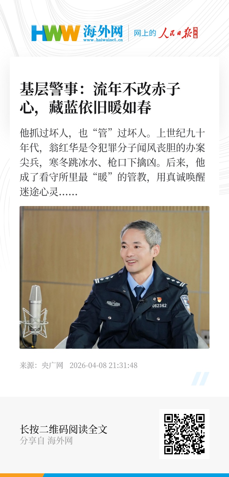 他抓过坏人,也“管”过坏人。上世纪九十年代,翁红华是令犯罪分子闻风丧胆的办案尖兵,寒冬跳冰水、枪口下擒凶。后来,他成了看守所里最“暖”的管教,用真诚唤醒迷途心灵,为失足者点亮新生之路。如今,58岁的他主动“沉”到社区,成了7260名居民的“定心丸”。33年从警路,他把警察这一行,干出了三种截然不同的模样。