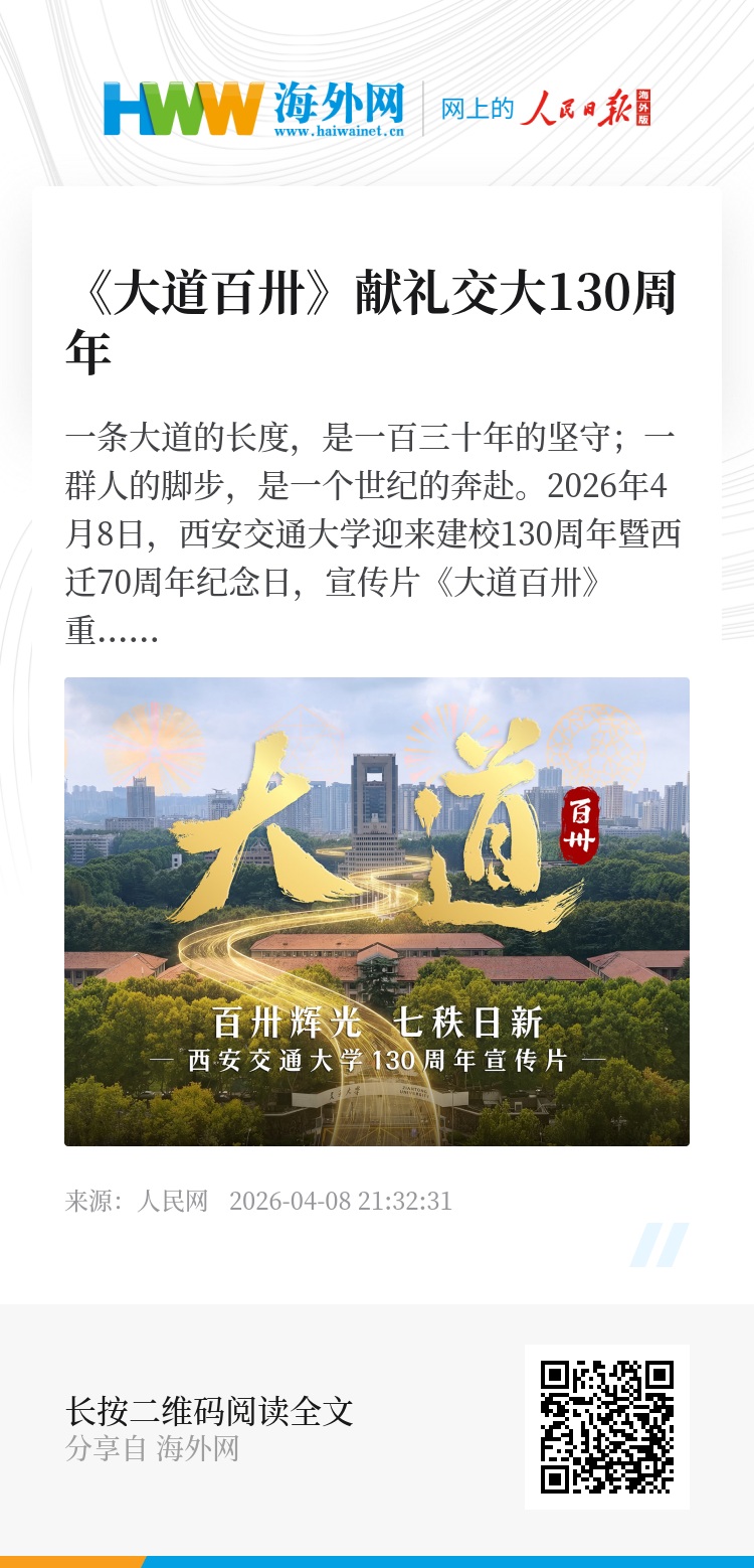 一条大道的长度,是一百三十年的坚守;一群人的脚步,是一个世纪的奔赴。2026年4月8日,西安交通大学迎来建校130周年暨西迁70周年纪念日,宣传片《大道百卅》重磅上线——看大道如虹,听步履铿锵。交大人,永远在路上。