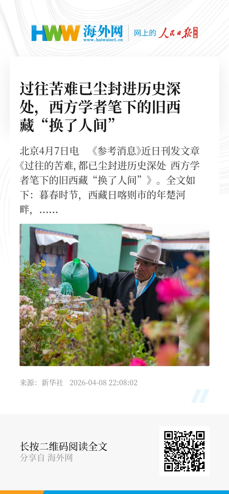 新华社北京4月7日电 《参考消息》近日刊发文章《过往的苦难,都已尘封进历史深处 西方学者笔下的旧西藏“换了人间”》。全文如下: