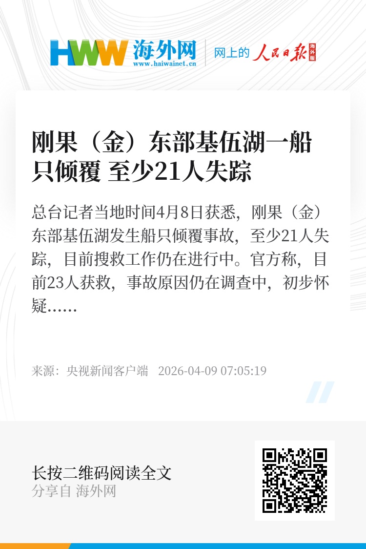 总台记者当地时间4月8日获悉,刚果(金)东部基伍湖发生船只倾覆事故,至少21人失踪,目前搜救工作仍在进行中。