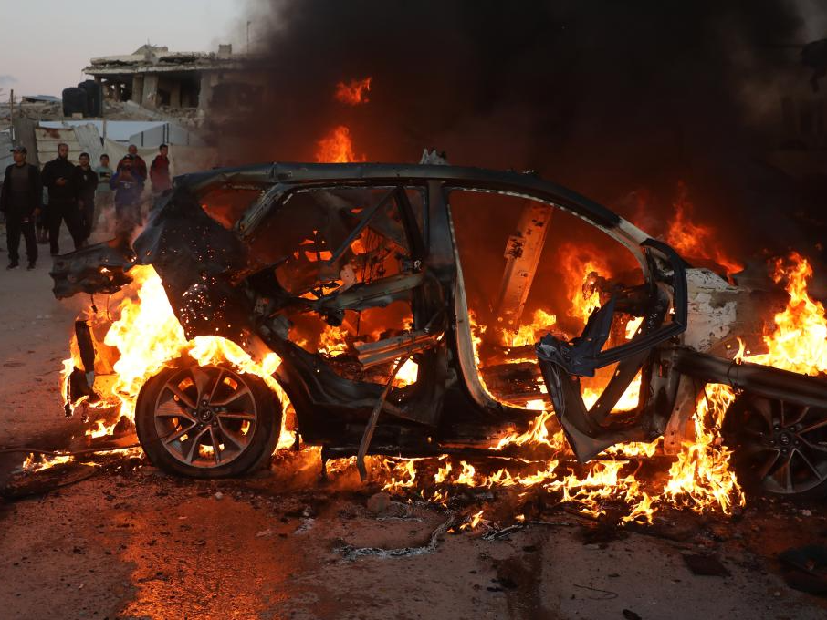 这是4月8日在加沙城拍摄的遭以军空袭后起火的车辆,车内一名半岛电视台记者遇难。新华社发(里泽克·阿卜杜勒贾瓦德摄)