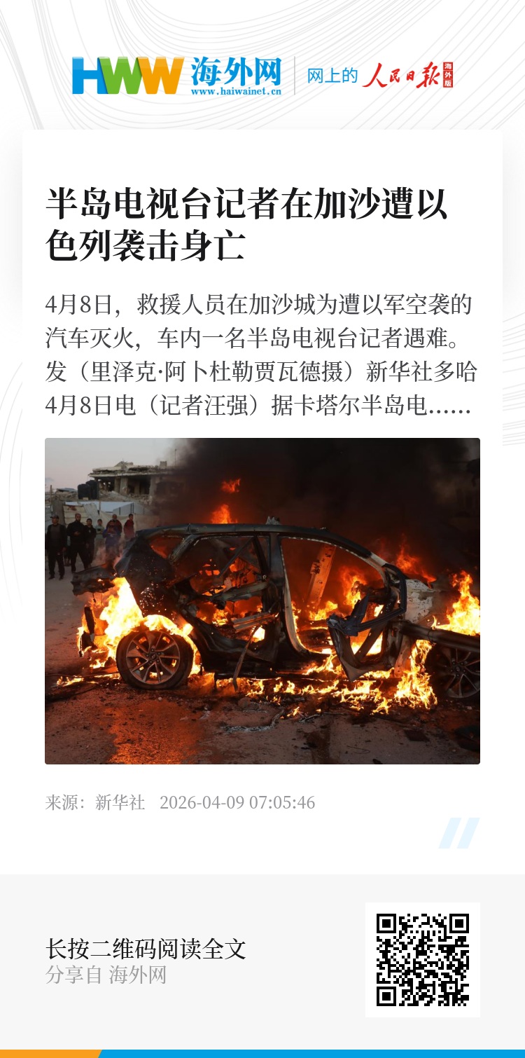 新华社多哈4月8日电(记者汪强)据卡塔尔半岛电视台8日报道,该台记者穆罕默德·维沙在加沙地带北部遭以色列袭击身亡。