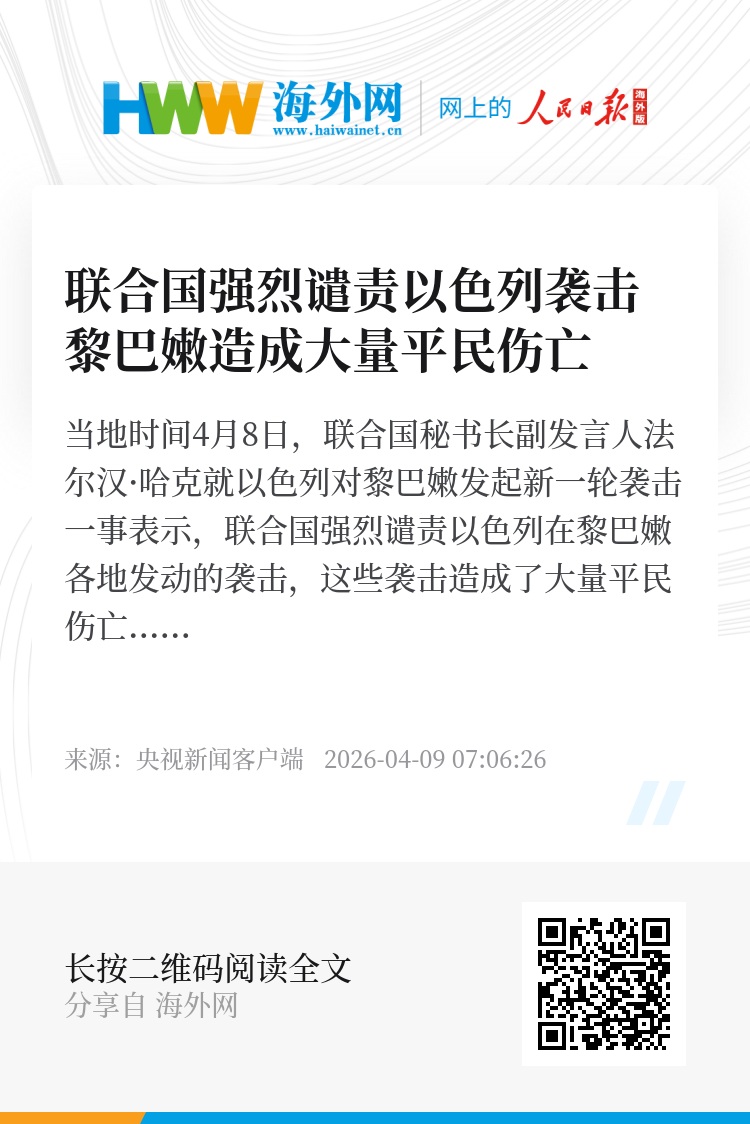 当地时间4月8日,联合国秘书长副发言人法尔汉·哈克就以色列对黎巴嫩发起新一轮袭击一事表示,联合国强烈谴责以色列在黎巴嫩各地发动的袭击,这些袭击造成了大量平民伤亡。联合国呼吁各方利用外交渠道,停止敌对行动,并重新致力于全面执行安理会第1701号决议。