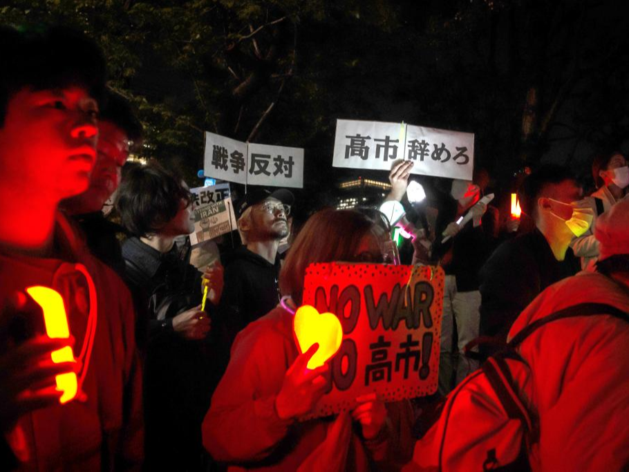 在集会现场,抗议者手持写有“守护宪法第九条”“不要战争”“高市政权即刻下台”等字样的标语,高喊“反对修宪”“反对战争”等口号,呼吁维护和平宪法。