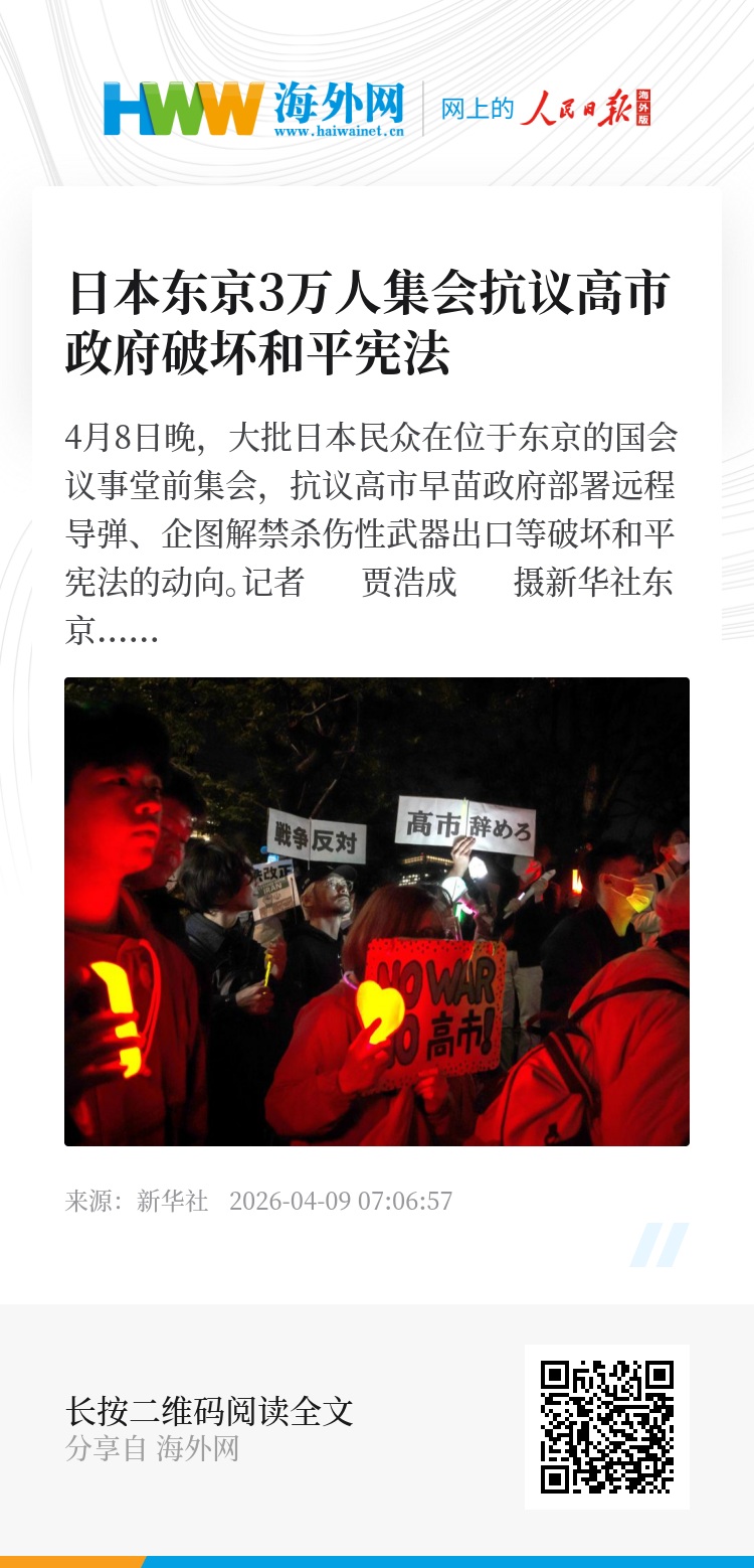 新华社东京4月8日电(记者陈泽安 李林欣)8日晚,大批日本民众在位于东京的国会议事堂前集会,抗议高市早苗政府部署远程导弹、企图解禁杀伤性武器出口等破坏和平宪法的动向。